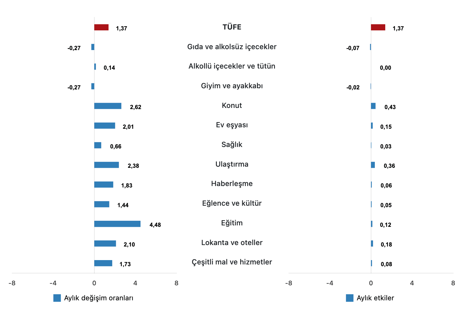 Aylık değişimlerine baktığımızda ise gıda ve alkolsüz içeceklerde %0,27 azalış, ulaştırmada %2,38 artış ve konutta %2,62 artış görüldü. İlgili ana grupların aylık değişime olan etkileri ise gıda ve alkolsüz içeceklerde %-0,07, ulaştırmada %0,36 ve konutta %0,43 oldu.