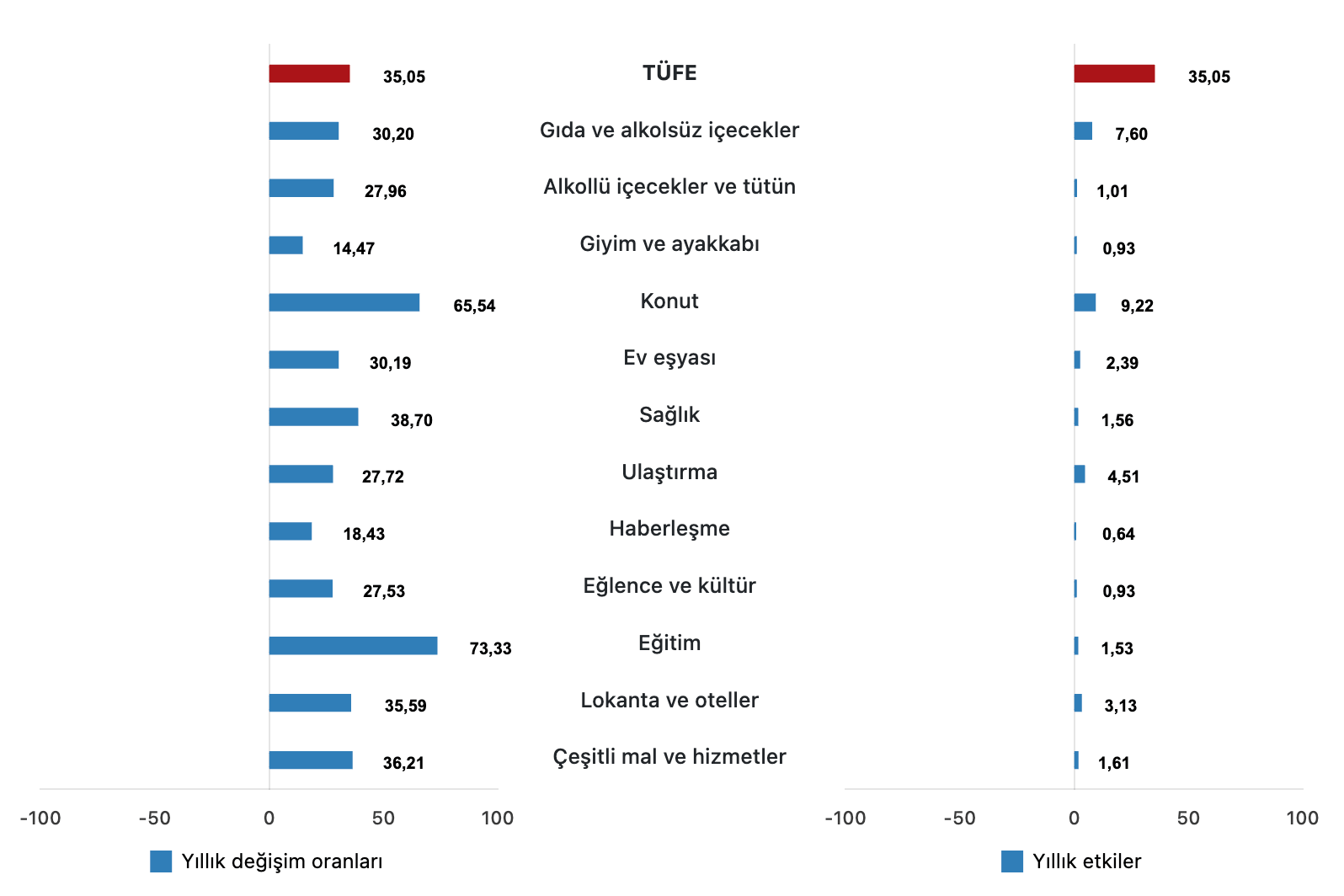 Buna göre; gıda ve alkolsüz içeceklerde yıllık %30,20 artış, ulaştırmada yıllık %27,72 artış ve konutta yıllık %65,54 artış gerçekleşti. İlgili ana grupların yıllık değişime olan etkileri ise gıda ve alkolsüz içeceklerde %7,6, ulaştırmada %4,51 ve konutta %9,22 oldu.